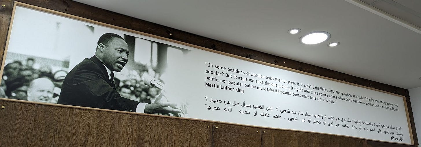 especially during his birthday weekend in the U.S. that we commemorate every year. I say they are in Palestine. The first time I read this MLK quote was in the office of the Bisan Center for Research and Development in November 2022.